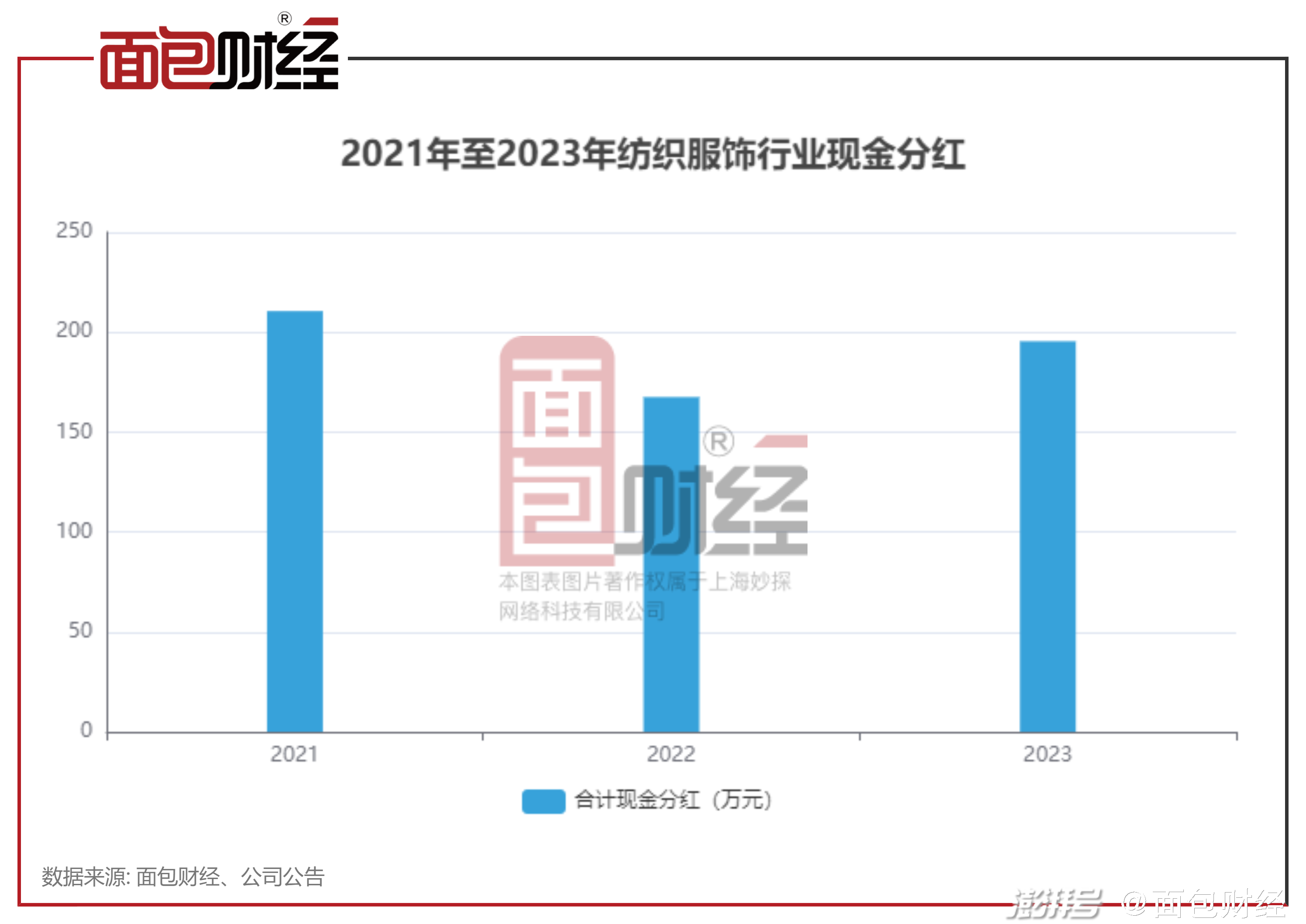 面包財(cái)經(jīng)梳理公開資料顯示,按照申萬一級(jí)行業(yè)分類,紡織服飾行業(yè)企業(yè)2023年現(xiàn)金派息金額(不包括回購等視同現(xiàn)金分紅的情況,下同)合計(jì)195.45億元,較2022年增加約27.94億元。